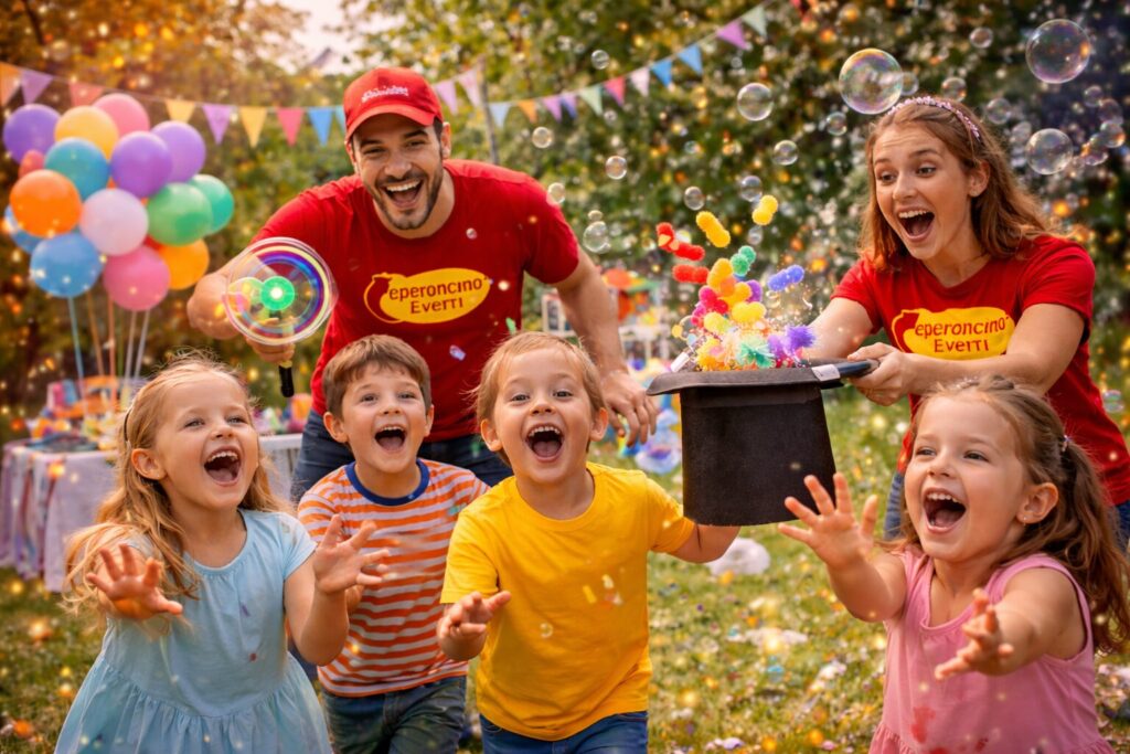 È una festa statica e flessibile, realizzabile sia al chiuso che all’aperto, ideale quando si desidera un’animazione semplice e ben organizzata.
